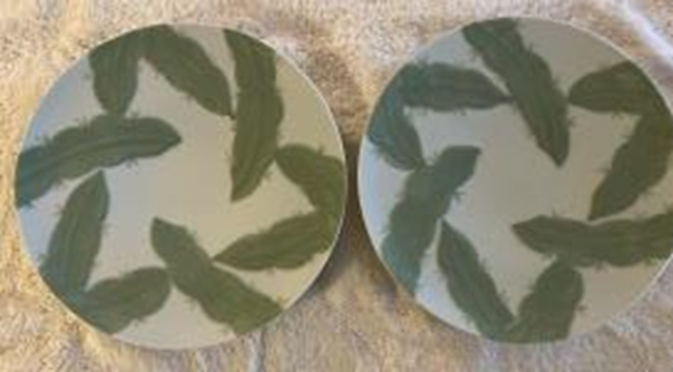 D-2 A pair of Celedon Style Decorative Plates; 8.75” Diameter. Makers markings with H’s in it. $55.00